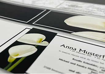 Im traurigen Fall des Verlust eines Angehörigen, helfen wir Ihnen als örtlicher Druckdienstleister unkompliziert und schnell bei der Erstellung sämtlicher Trauerdrucksachen. Hierzu zählen Trauerkarten, Anzeigen in den regionalen Zeitungen, Totenzettel, Kaffeekarten und das Erinnerungsbild für die Trauerfeier. Ferner halten wir eine Auswahl unterschiedlicher Trauerbriefhüllen immer bereit. Die Produktion der Trauerpost erfolgt mit höchster Priorität, in kürzester Zeit.