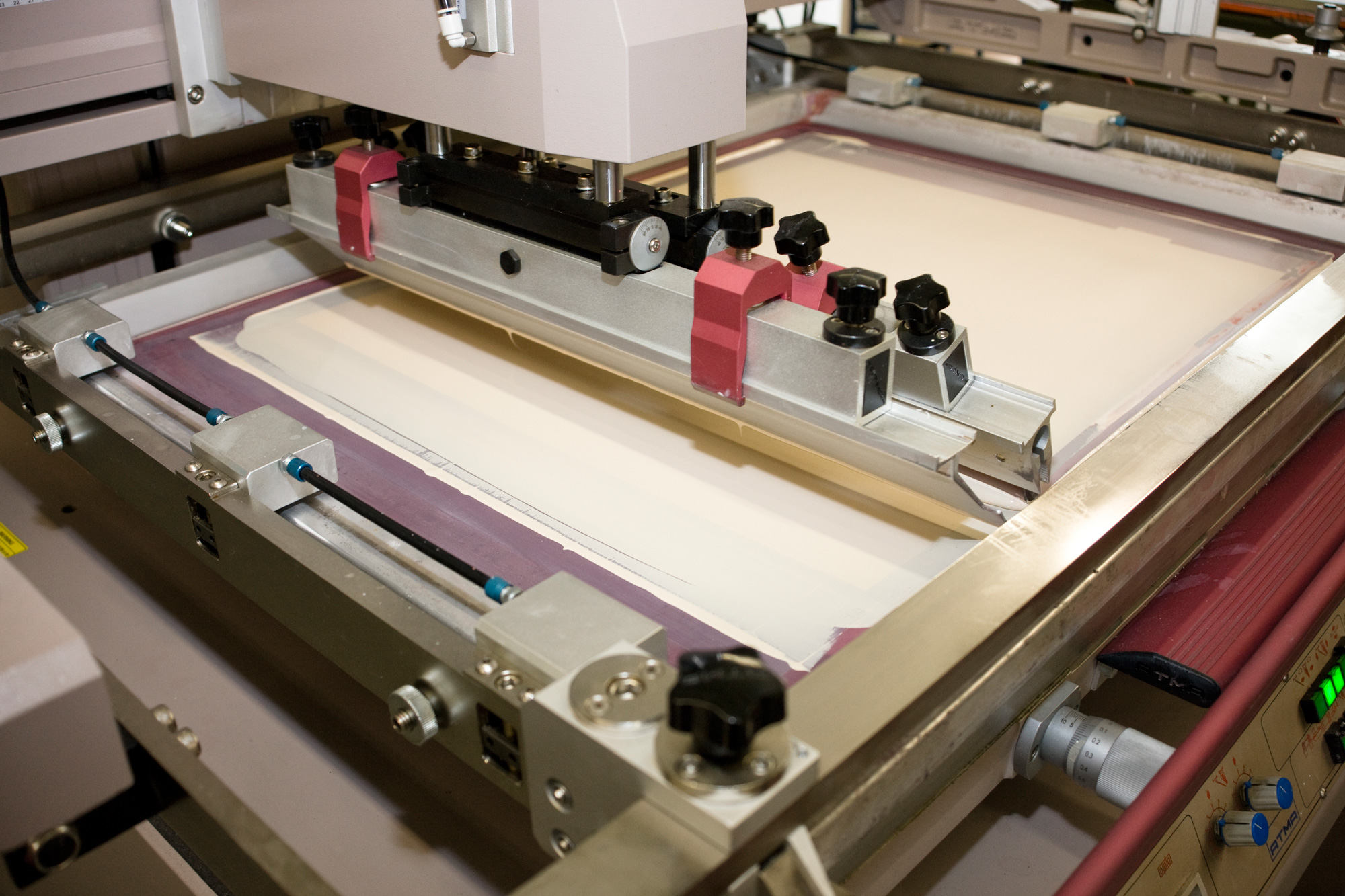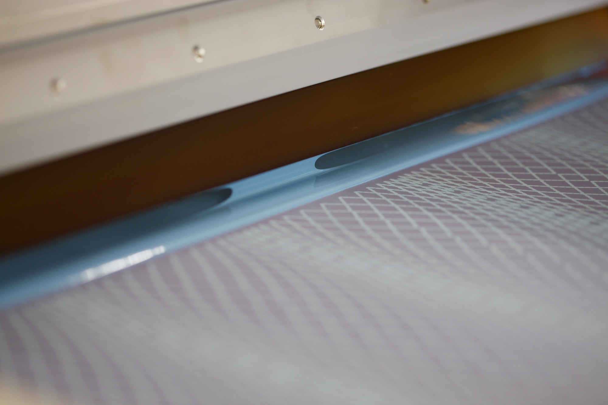 Als eine Art "Versuchsmanufaktur" arbeiten wir im Bereich der Substratbeschichtung. Hier testen wir in Zusammenarbeit mit unseren Kunden neue Coatings, Farben oder bemustern neue Substrate im Flachsiebdruck.