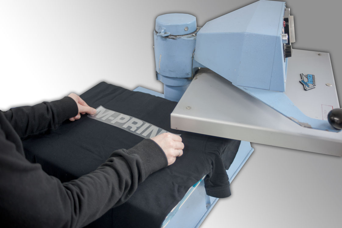 Der Transferdruck ist ein indirektes Druckverfahren, bei dem zunächst ein Träger bedruckt oder in dem aus einer speziellen Flex- oder Flockfolie das Motiv per Schneideplotter geschnitten und entgittert wird. Das Motiv auf dem Träger wird anschließend mit Hilfe einer Transferpresse, unter Hitze und Druck, auf das Textil übertragen.